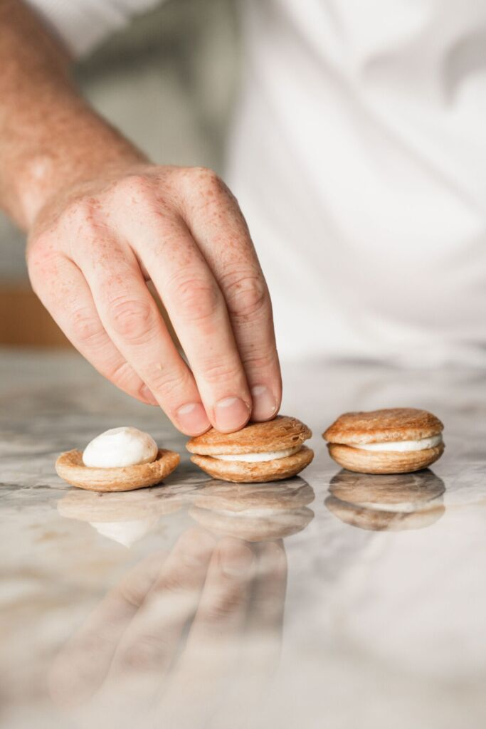Lo mismo ocurre con su macaron hojaldrado: dos finas láminas de hojaldre con un relleno entre ellas, todo con la forma de un macaron. Tras muchas pruebas, Stijn aún no está completamente satisfecho, pero se acerca cada vez más al resultado esperado. La clave es perseverar.