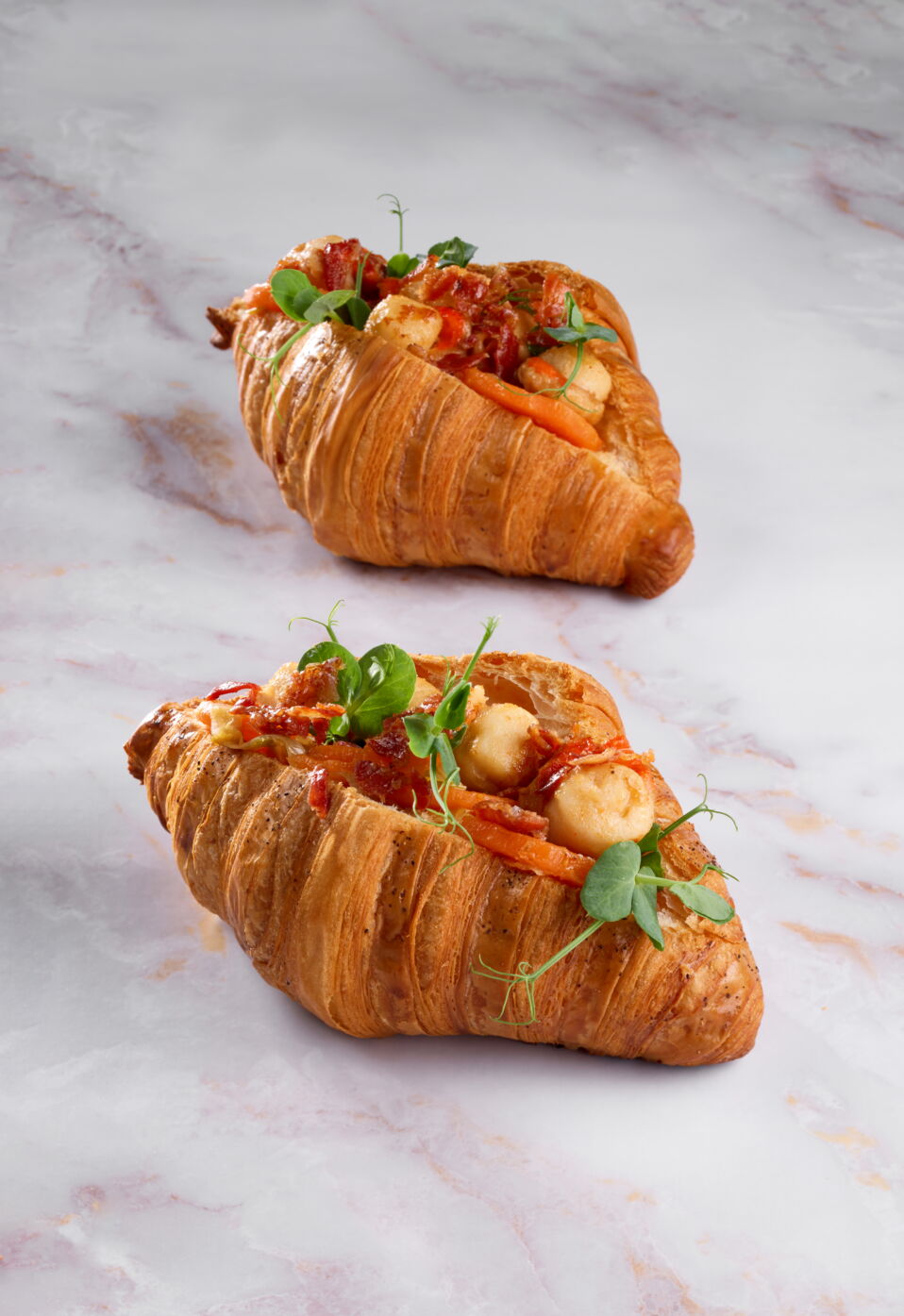 - Make an incision on the top of the croissants and fill them with the scallops and leek-carrot mixture.
