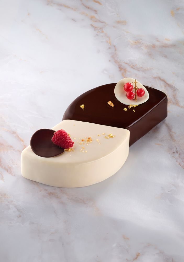 - Part for HER : Pour the mousse to just under hald the height cool to 4°C. Place the biscuit, pour the raspberry cream (0.5 cm from the edge), then the milk chocolate raspberry supreme. Close with the biscuit with the crunchy side visible. Freeze, unmold, flip and glaze.