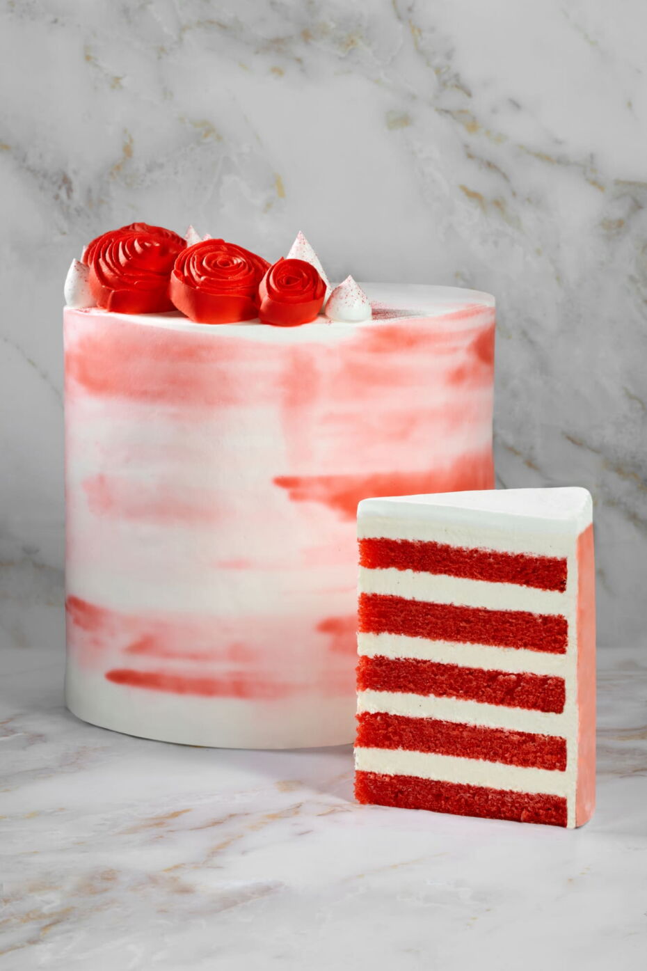 Smooth the surface with a plastic scraper and spatula until perfectly smooth and even. Using a petal nozzle and a flower nail, pipe roses with the remaining red Sculpture and arrange them in a crescent shape on top of the cake.