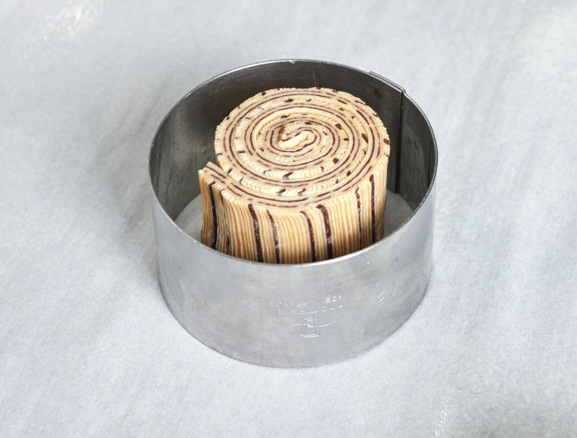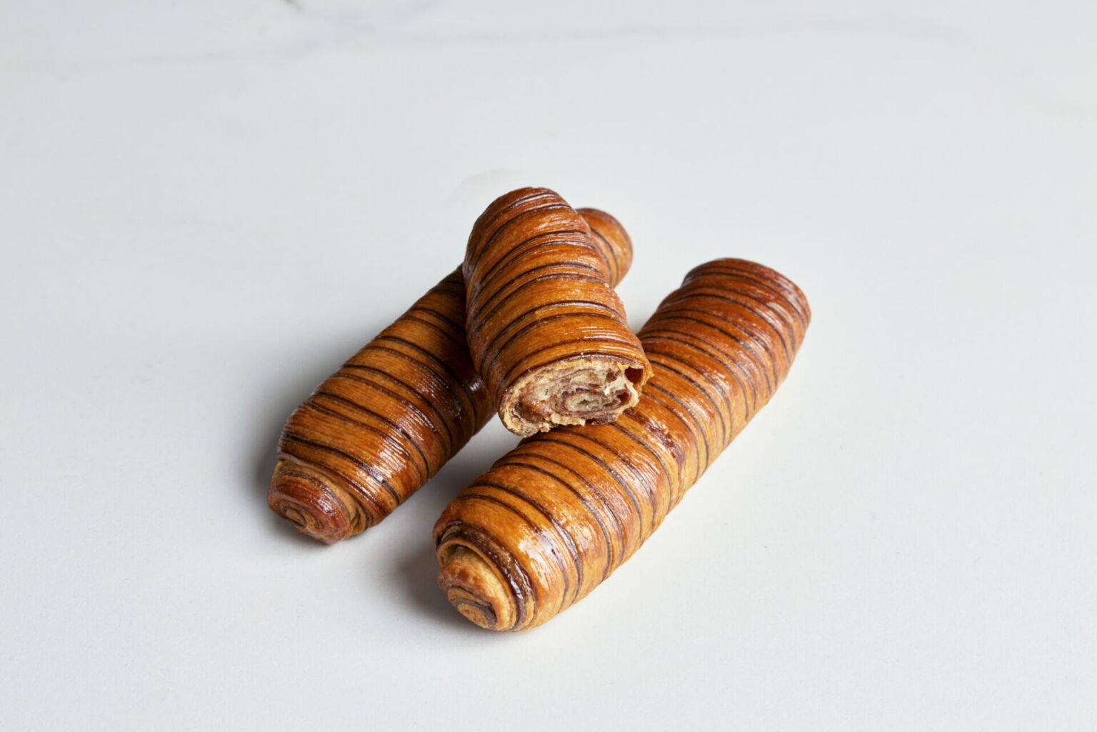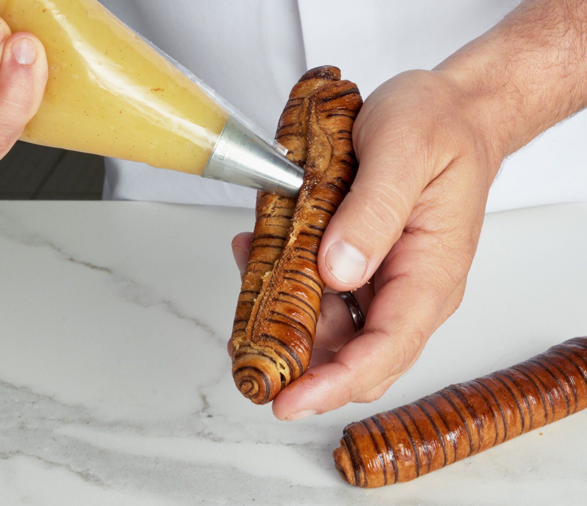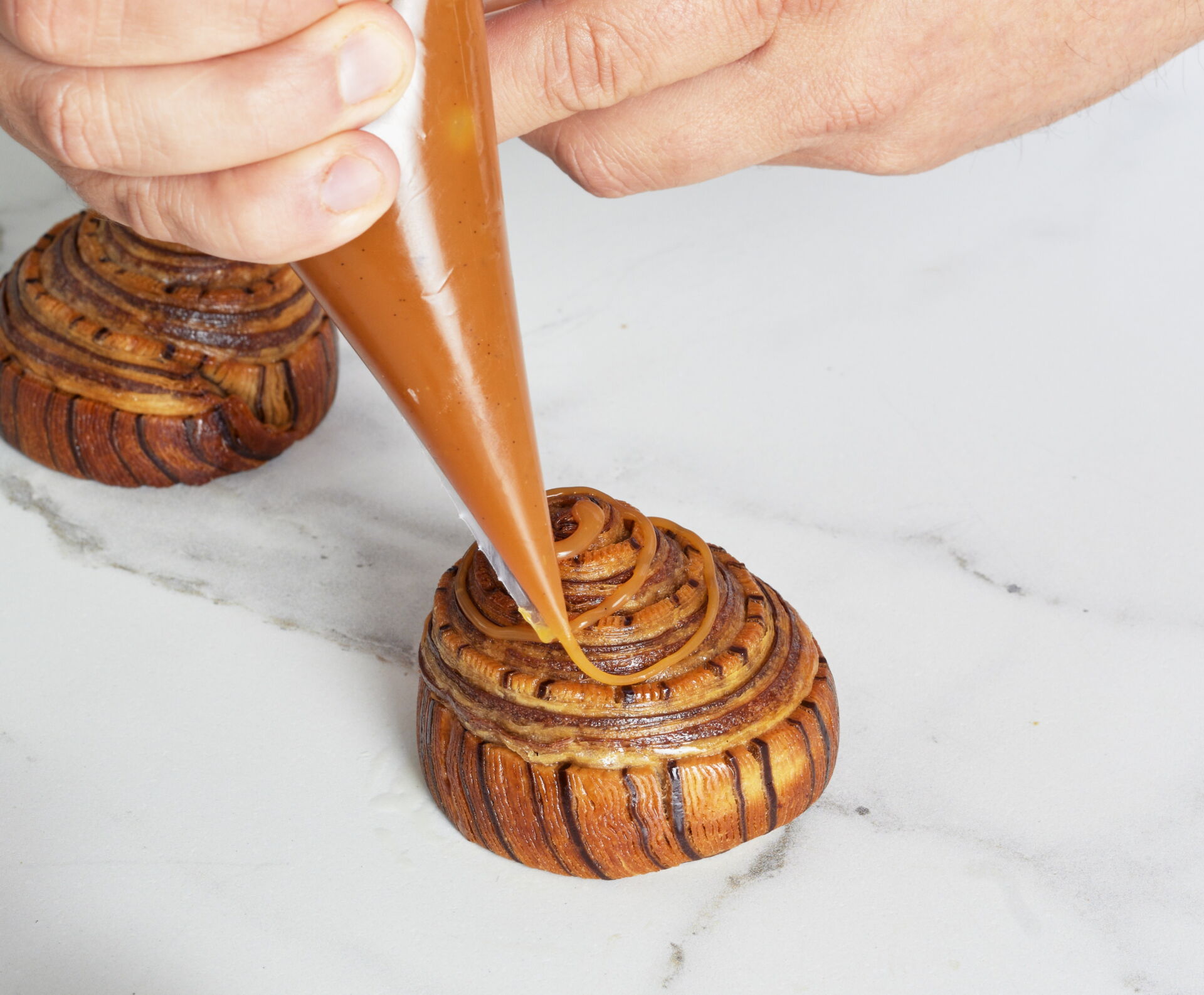 Pierce the base of the spirals and fill with caramel followed by vanilla diplomat cream.