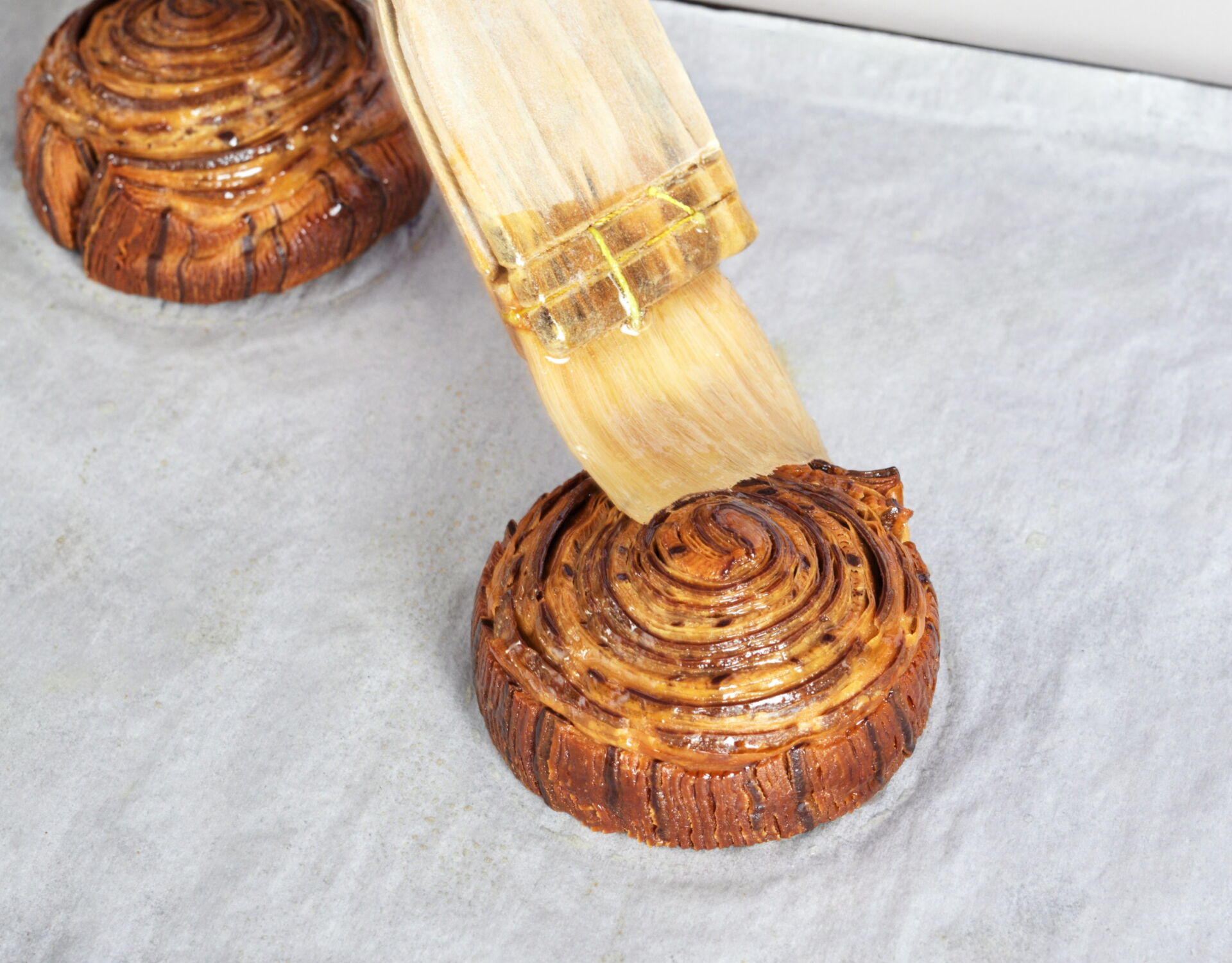 Lightly brush with egg wash and let proof for 2 hours at 26°C. Brush again with egg wash and bake at 170°C for approximately 15 minutes. Glaze with gum arabic syrup.