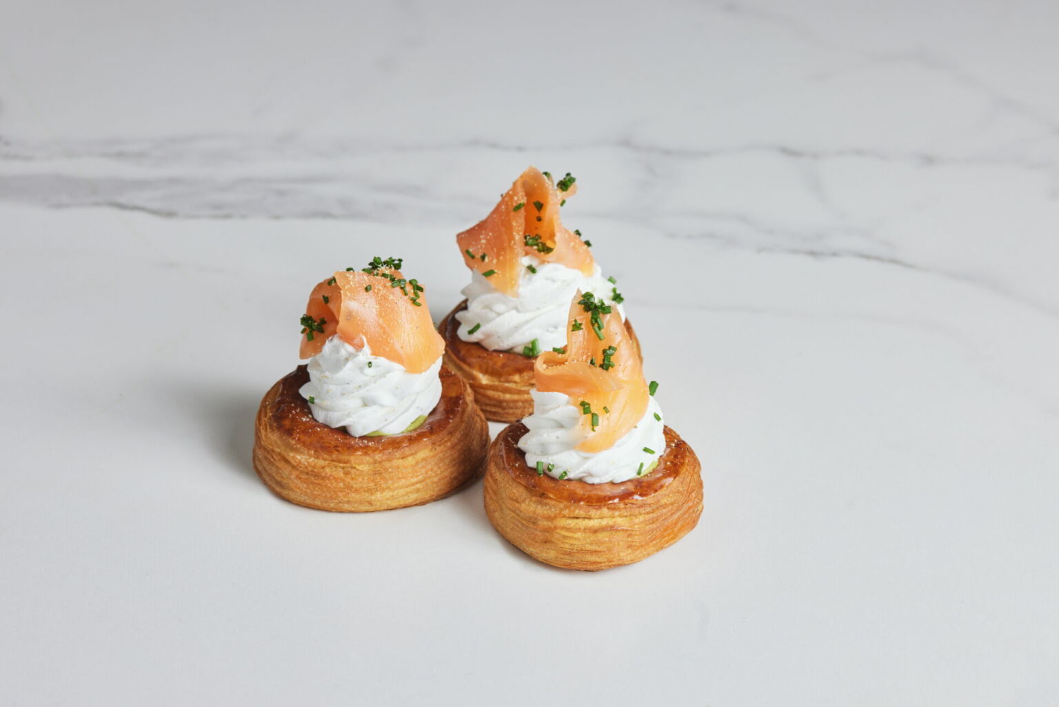 Top with 10 g of smoked salmon flakes and sprinkle with chopped chives.