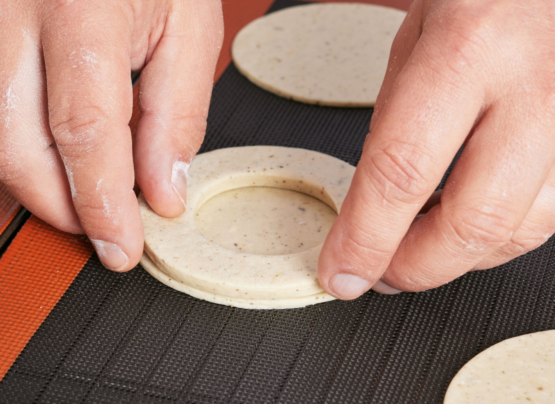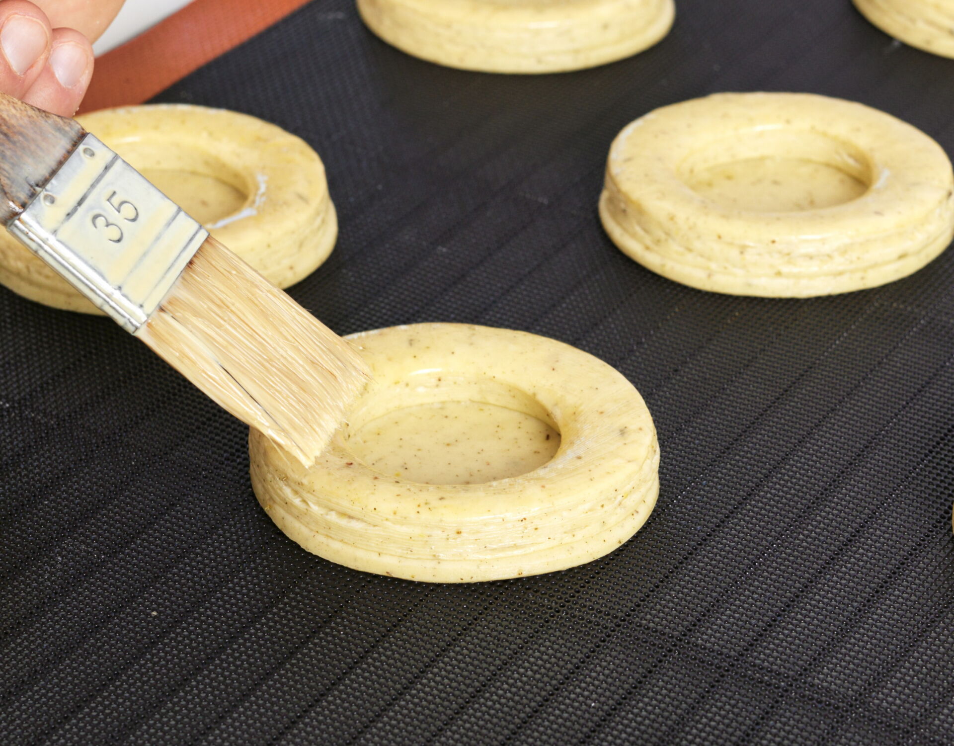 Brush the rings with egg wash then place on top of the base discs.