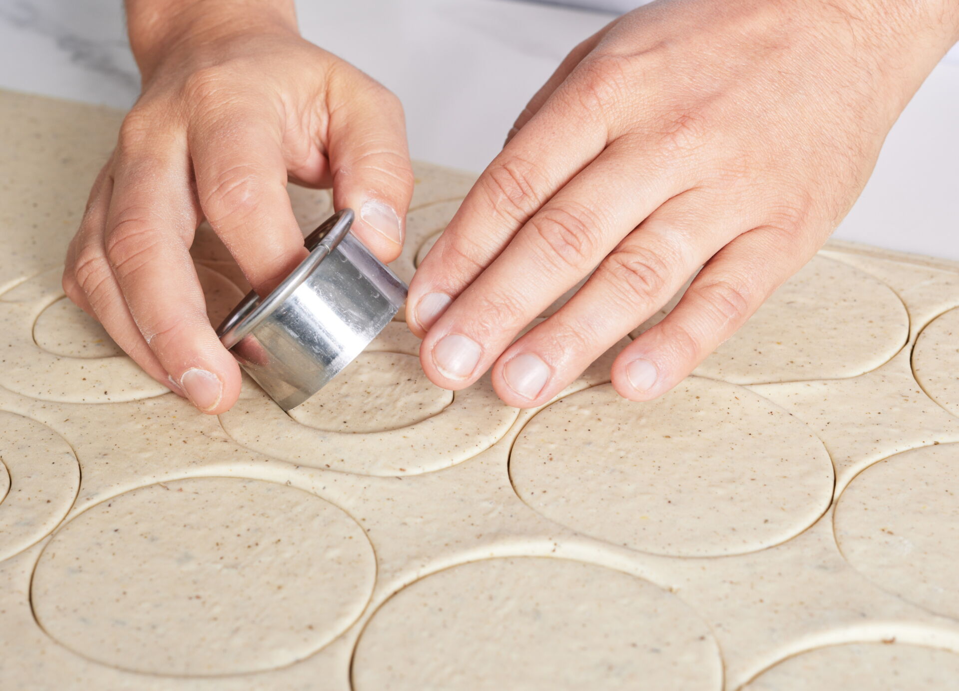 Roll the trimmings to a thickness of 1.5 mm and freeze for 10 minutes. Cut out another 12 Ø9 cm discs for the bases.