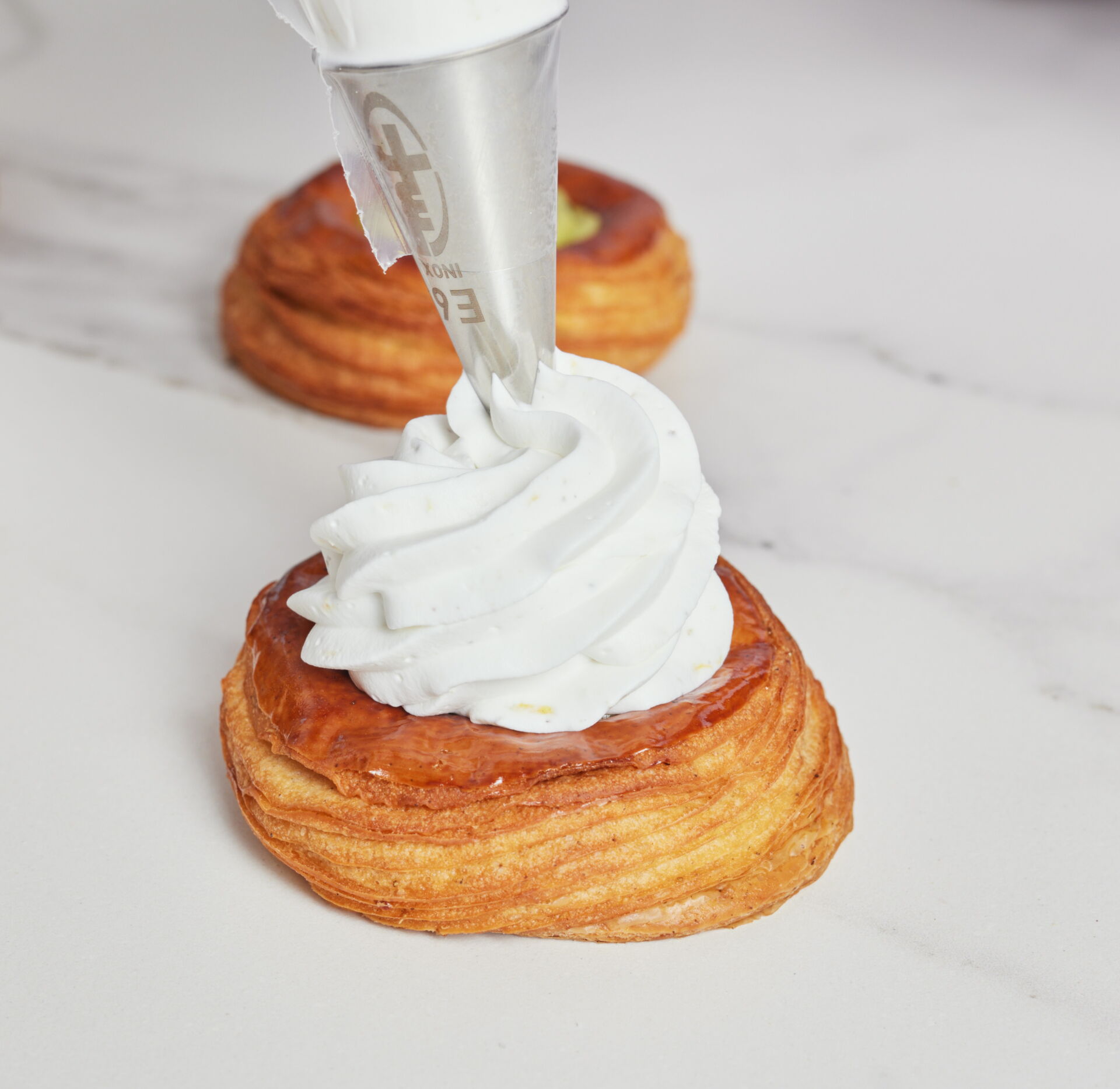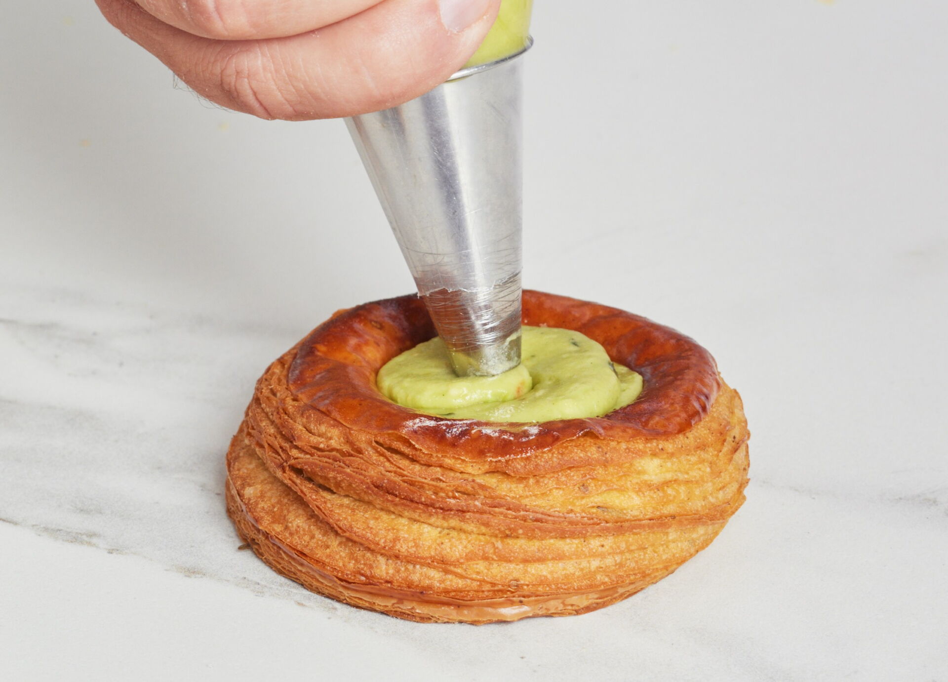 Using a piping bag fitted with a fluted nozzle (F8), pipe out 20 g of lemon Sculpture.