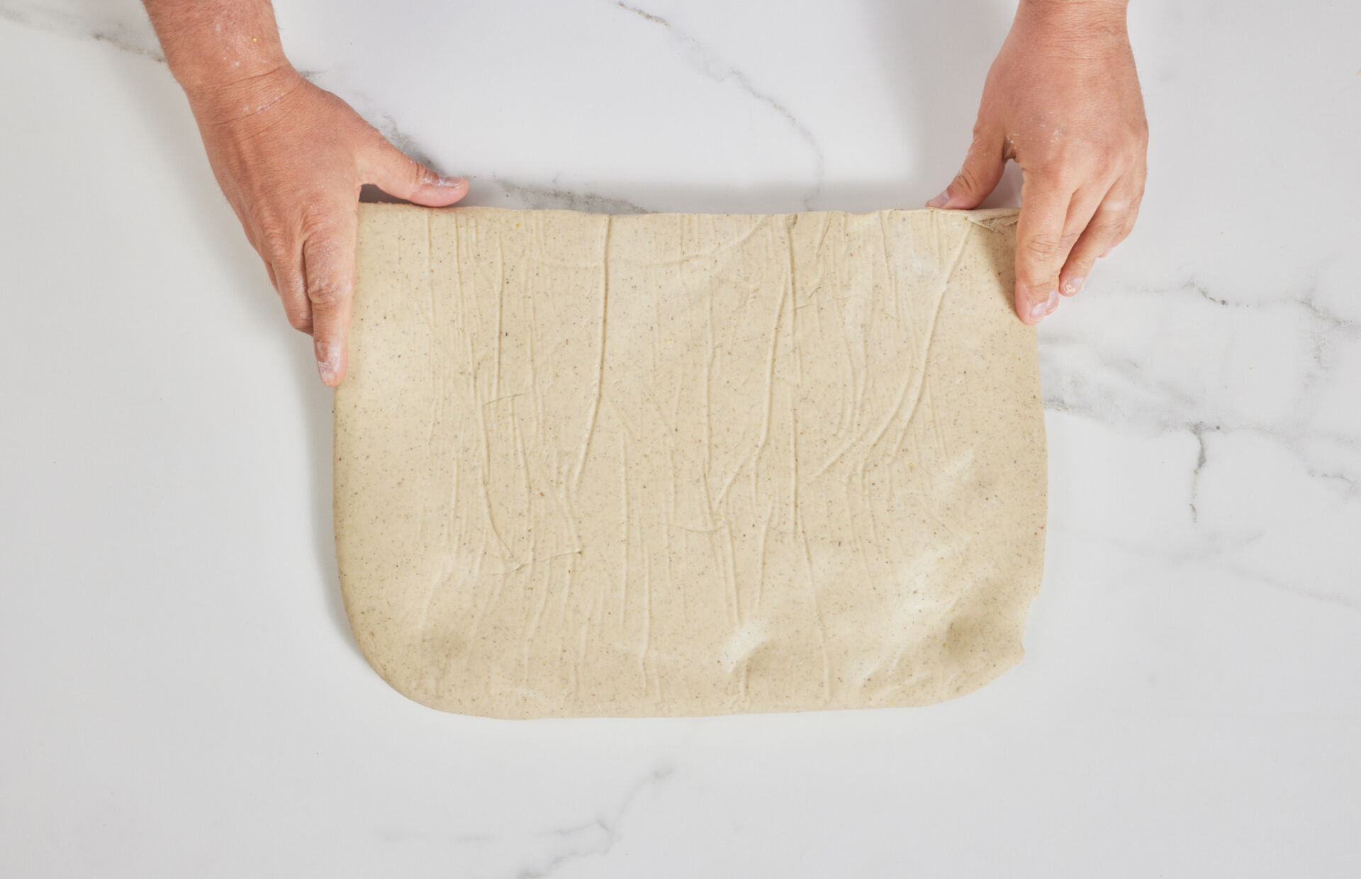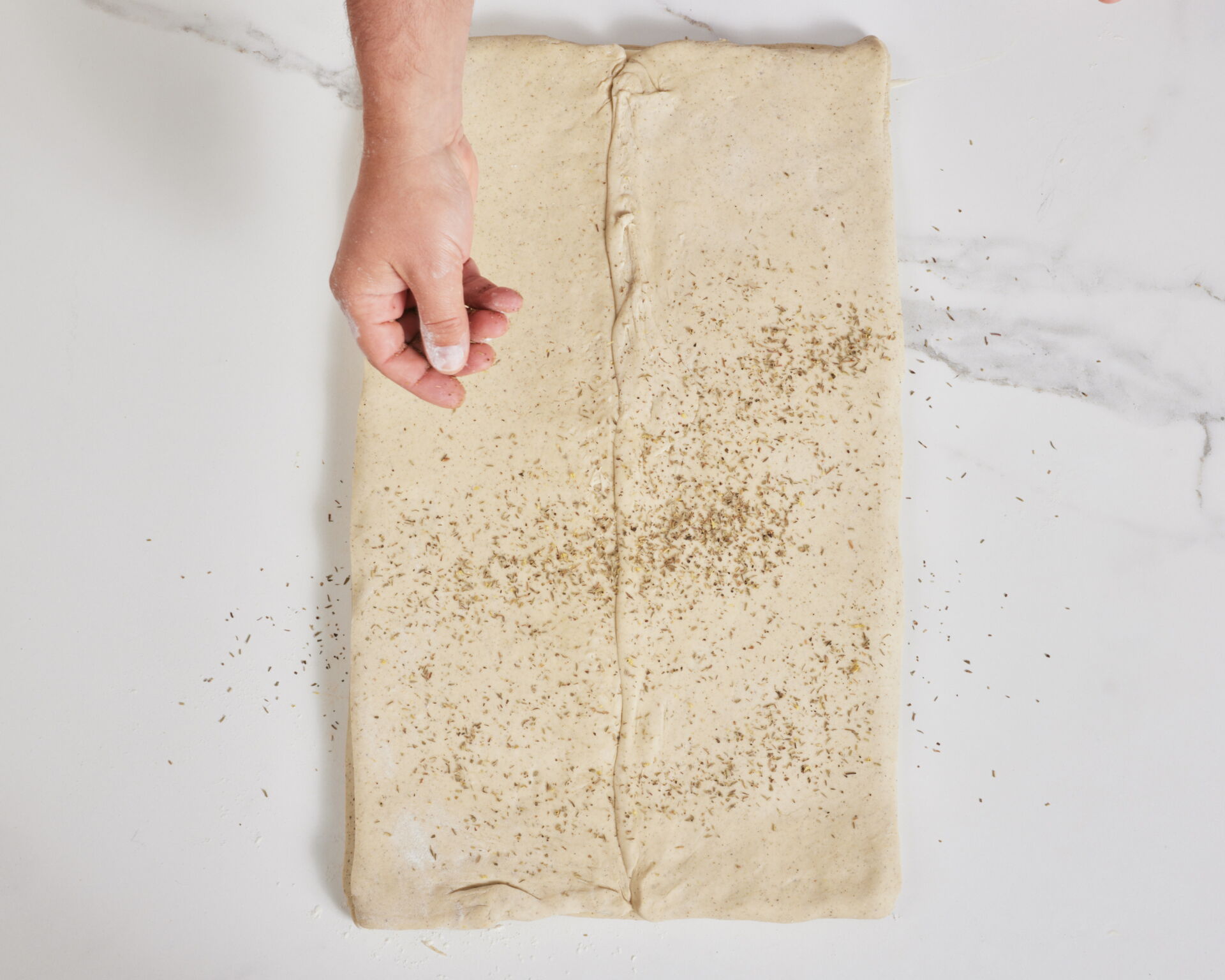 Roll to 6 mm thickness and give one double turn, adding dried thyme at each step.