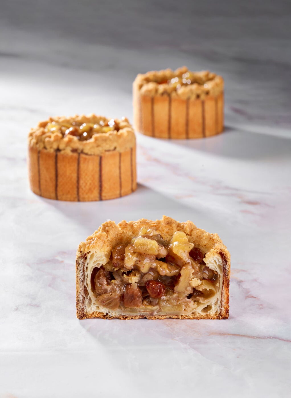 Répartir 8 g de crumble aux noix dans les fonds de pâte à croissant. Garnir généreusement avec la préparation aux pommes (environ 30 g), puis répartir le reste du crumble sur la surface, autour du bord du moule. Cuire à 170 °C pendant environ 15 minutes. À la sortie du four, napper les pommes de nappage neutre.