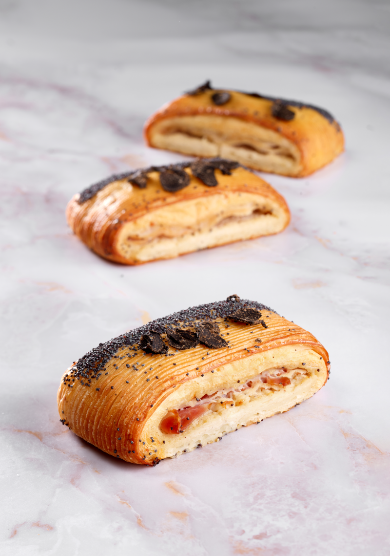 Laminare la pasta a 15 mm di spessore. Ritagliare alcune strisce da 10 mm e distribuire per il verso lungo fino a coprire l’intera pasta. Riporre in congelatore o abbattitore a -2 °C per 10/15 minuti. Laminare a 2,8 mm di spessore, ritagliare dei rettangoli di pasta da 5 x 26 cm; farcire al centro con besciamella da forno e fettine di bacon. Mettere a lievitare a 25 °C per 90 minuti. Infornare a 175 °C e cuocere per 18/20 minuti. Una volta cotti e sfornati, spolverare lo scorzone di tartufo.