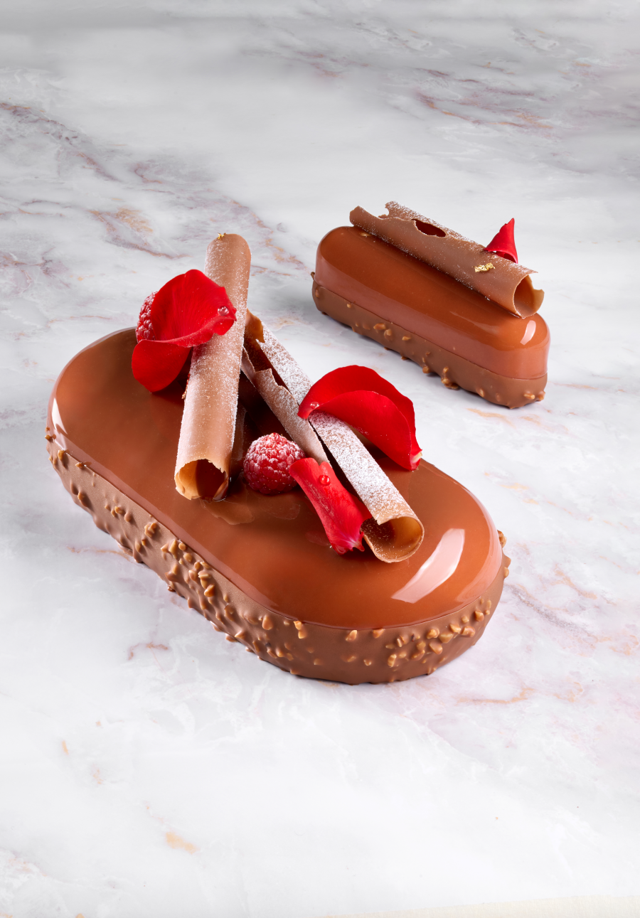 Comporre l’interno dentro la quadra da 20 x 20 cm in cui abbiamo cotto la tenerina. Cospargere il fondo della tenerina con 80 g di croccante. Distribuire uno strato di lamponi poché (150 g). Colare uno strato di cremoso sopra i lamponi (330 g). Raffreddare e versare uno strato (280 g) di gelée ai lamponi e rosa. Abbattere a -18 °C. Tagliare dei rettangoli 21 x 8,5 cm. Colare 300 g di bavarese alla nocciola all’interno degli stampi Pavoni KE034 e abbattere a -18 °C. Smodellare e glassare con la glassa al cioccolato a 45 °C. Decorare la superficie con cortecce di cioccolato, petali di rosa, lamponi, nocciole e gocce di rugiada ottenute con la glassa neutra.